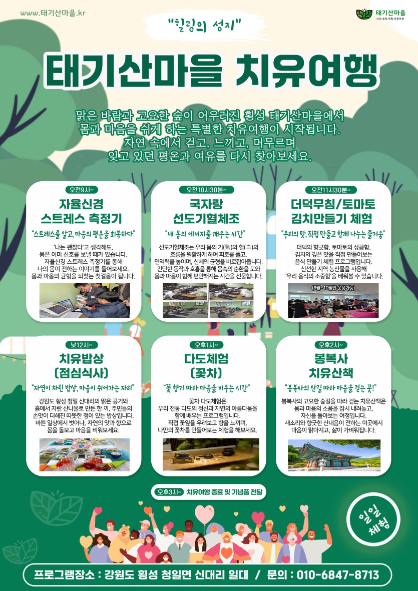 태기산마을 치유여행 페이지 정보 작성자 최고관리자 댓글 댓글 0건 조회Hit 27회 작성일Date 25-06-09 20:46 본문 태기산마을 치유여행 목록 글쓰기 이전글스트레스 측정기로 자신의 상태를 검사결과지로 확인하여 알려주다! 25.08.17 다음글반려동물 동반가능합니다. 25.04.11 댓글 0 댓글목록 등록된 댓글이 없습니다.
